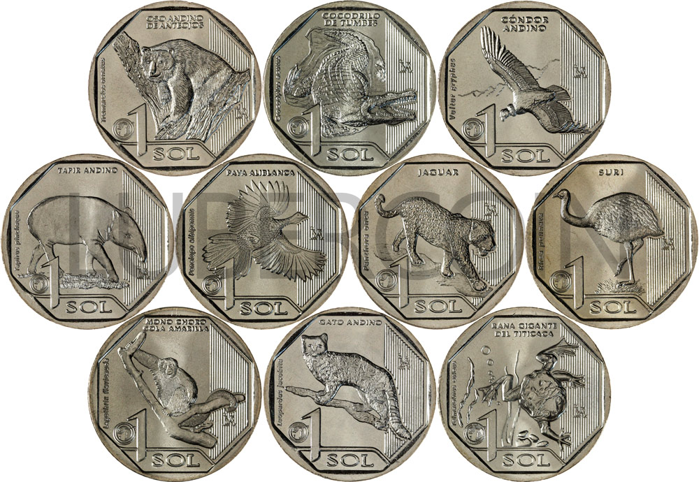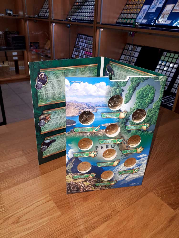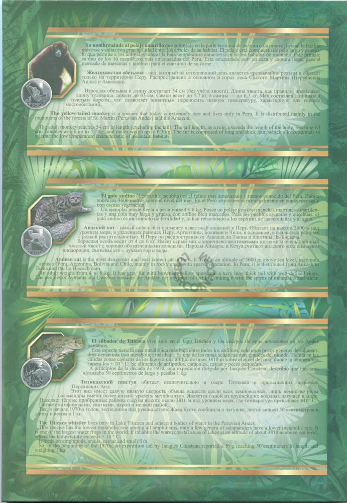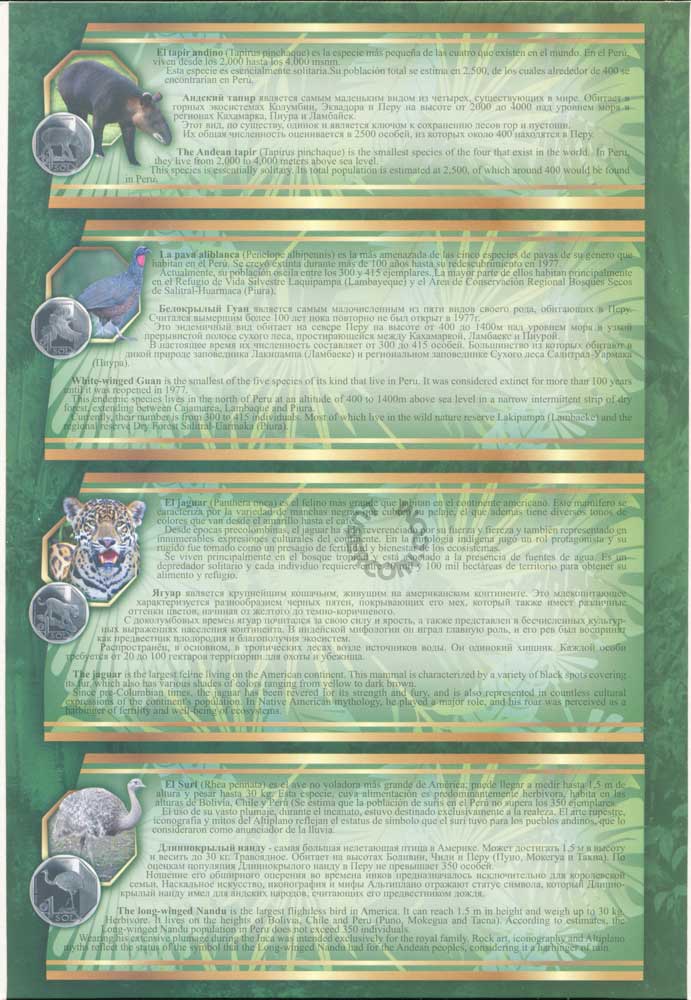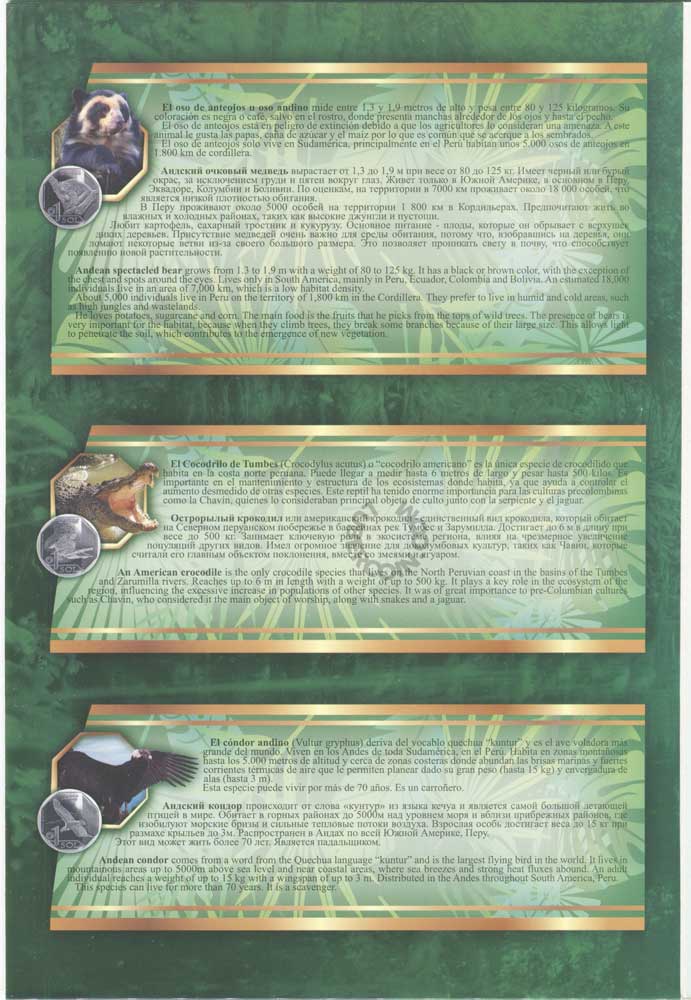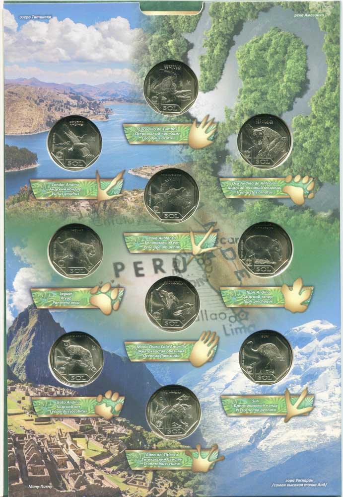 В наборе 10 монет. Каждая посвящена одному животному, находящемуся на грани вымирания и обитающему на территории Перу.