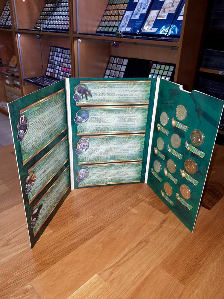 Набор упакован в неофициальный альбом «капсульного» типа. «Капсульный» альбом — условное название. В таком альбоме каждая монета крепко держится в своей ячейке и не крутится. Ячейки закрываются плотным пластиком, но не герметично.