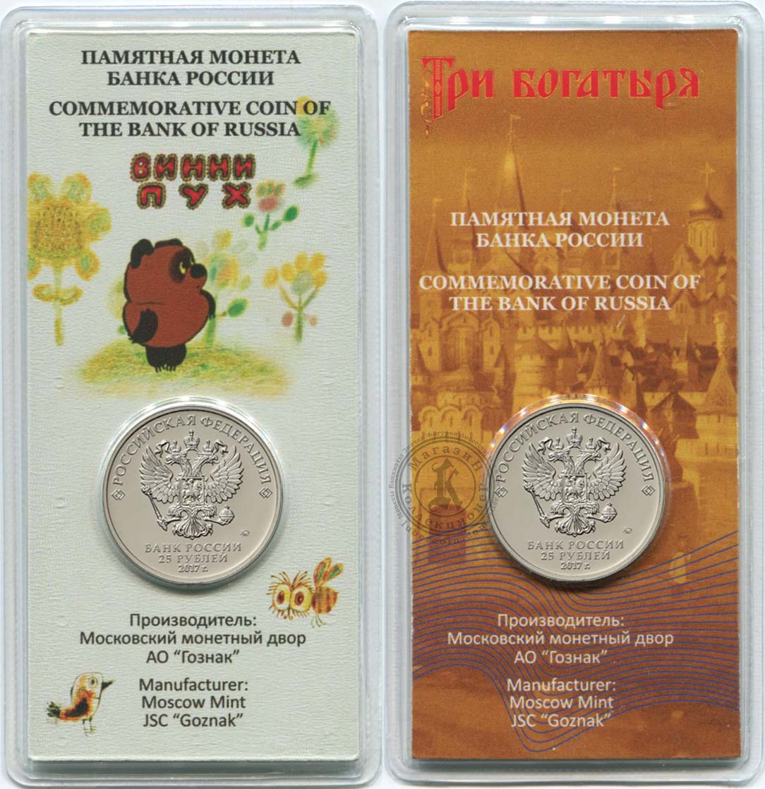 25 рублей 2017 Мультипликация: Винни Пух и Три богатыря (2 монеты) Цветные UNC
