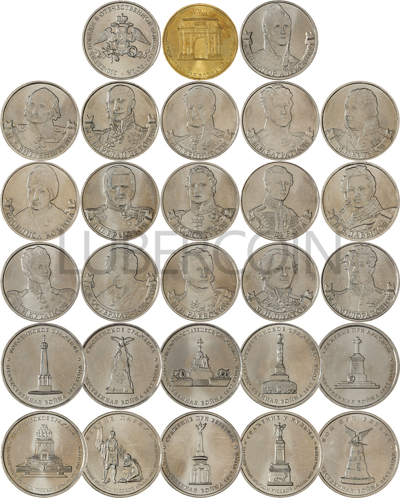 Набор посвящен юбилею победы в Отечественной войне 1812 года. В наборе 28 монет номиналом 2, 5 и 10 рублей.