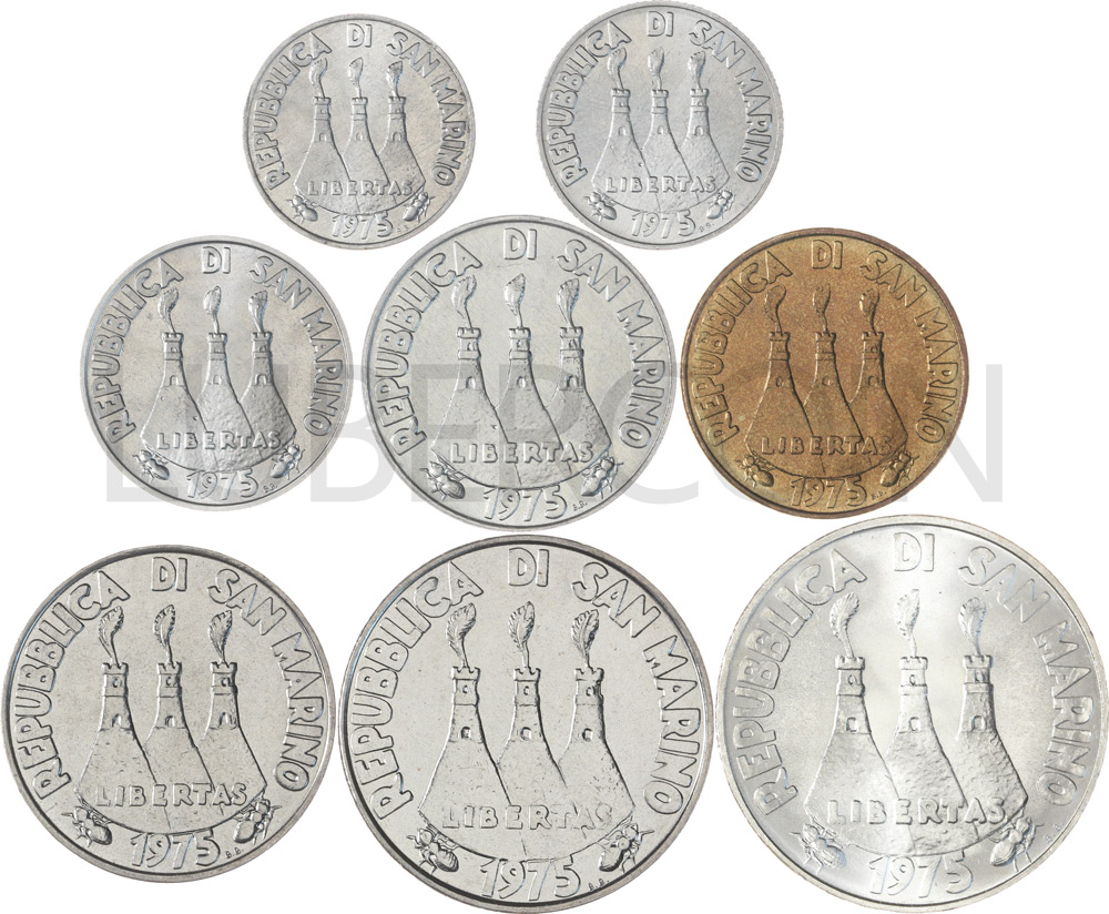 Сан-Марино набор монет 1, 2, 5, 10, 20, 50, 100, 500 лир 1975 (8 монет) UNC (Патина)