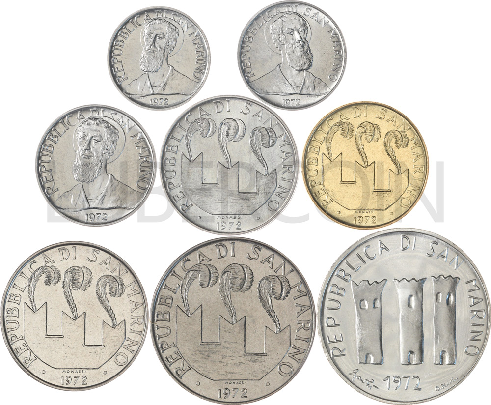Сан-Марино набор монет 1, 2, 5, 10, 20, 50, 100, 500 лир 1972 (8 монет) UNC (Патина)