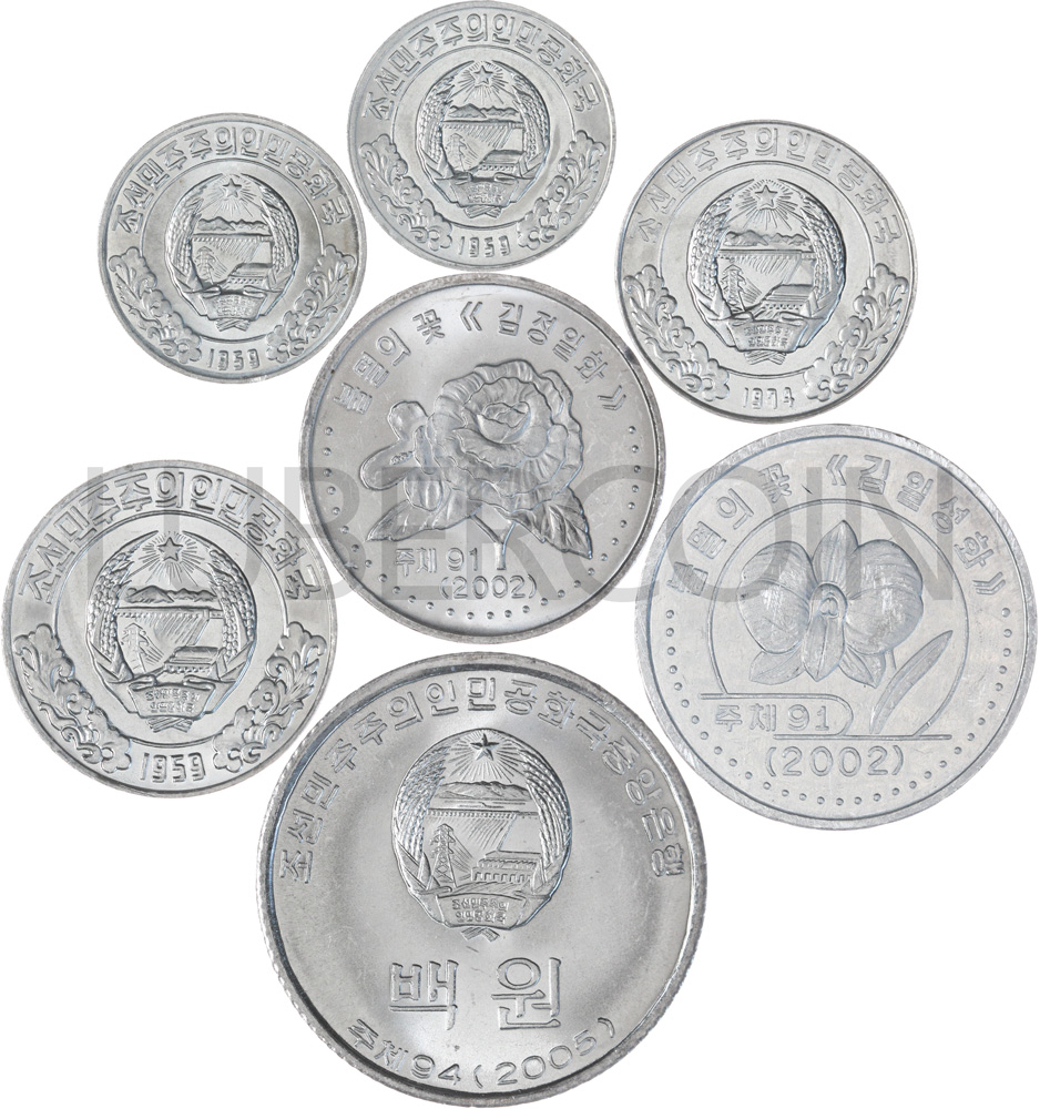 Северная Корея набор монет 1, 5, 10, 50 чонов, 1, 100 вон (7 монет) UNC