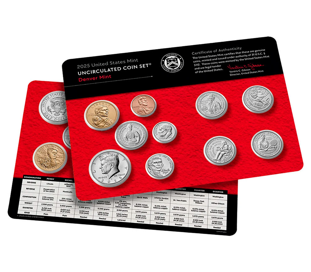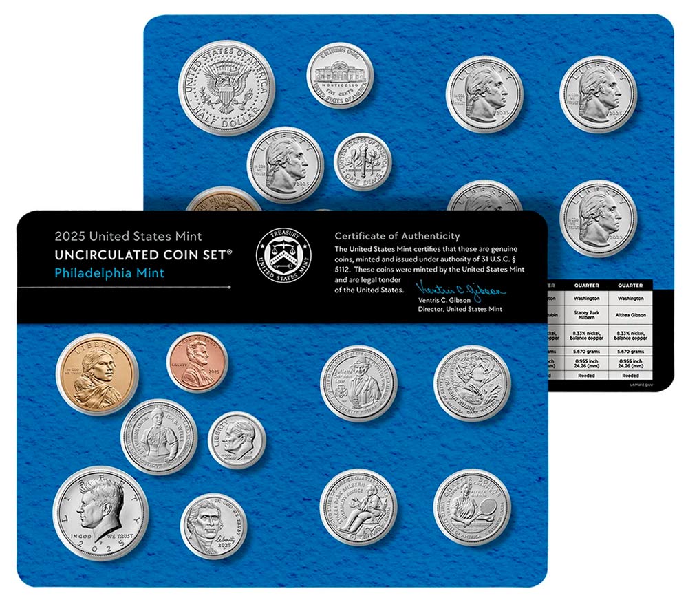 США набор монет 1, 5, 10, 25, 50 центов, 1 доллар 2025 P+D (20 монет) UNC