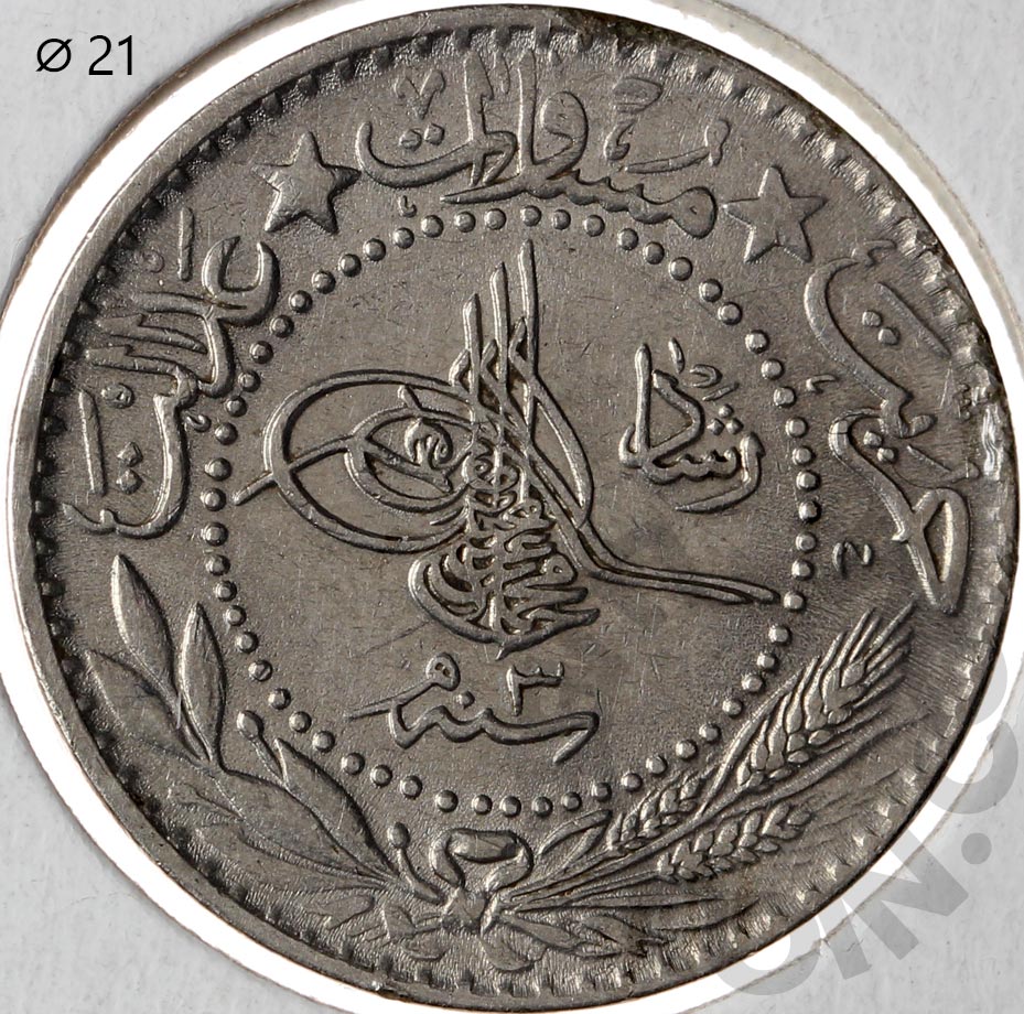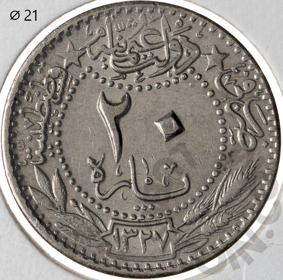 Турция 20 пар 1909 «Reshat» справа тугры. "٣" под тугрой (00046464)