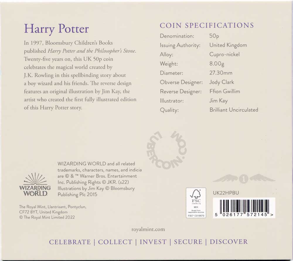 Великобритания 50 пенсов 2022 Гарри Поттер. Портрет (Монета в оригинальном буклете) BU