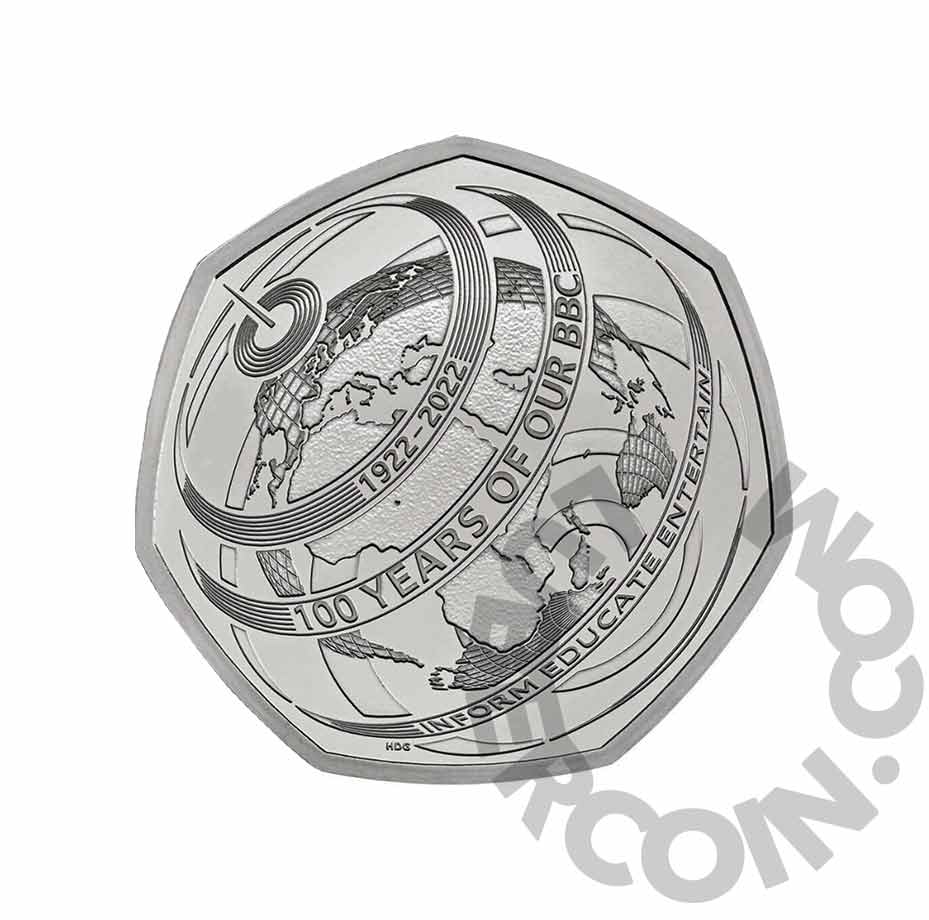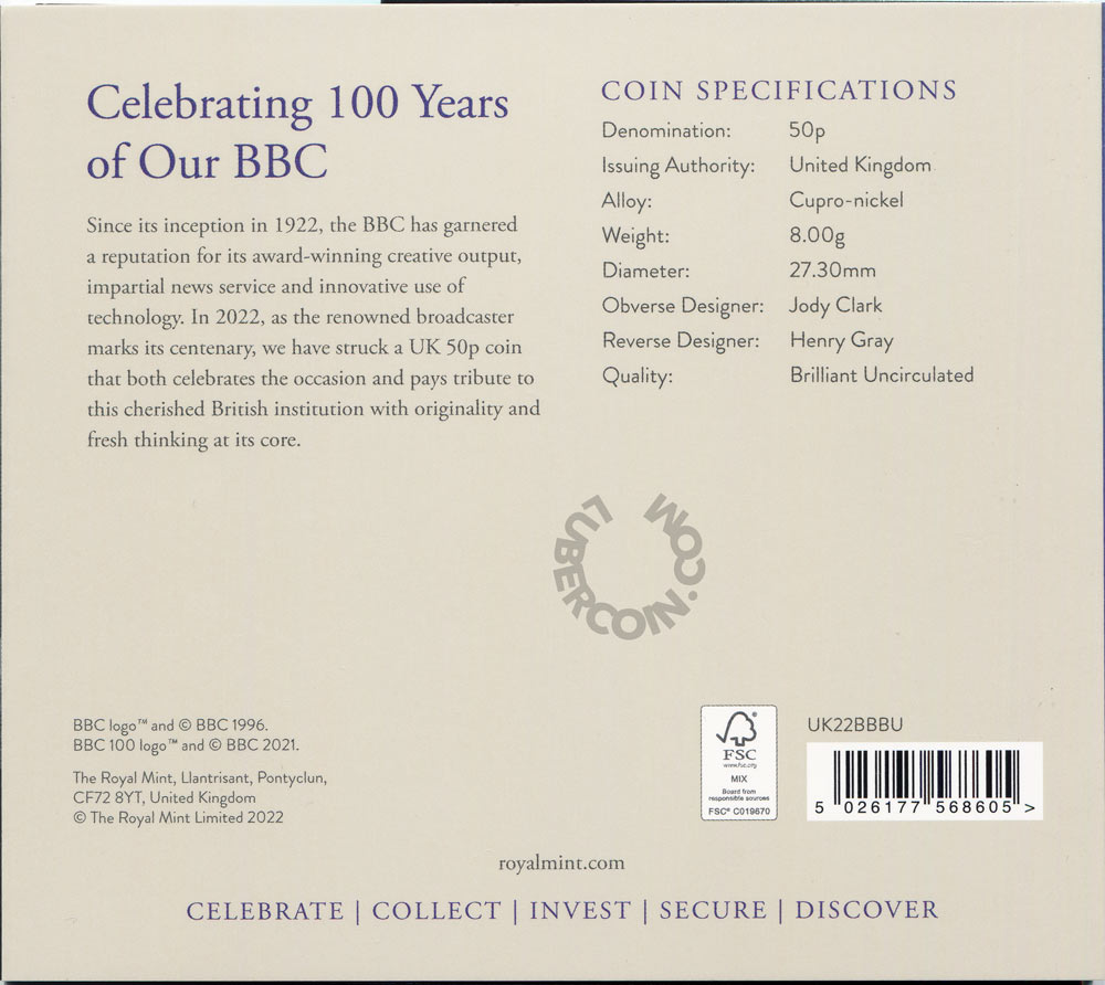Великобритания 50 пенсов 2022 Би-би-си. 100 лет со дня основания (Монета в оригинальном буклете) BU