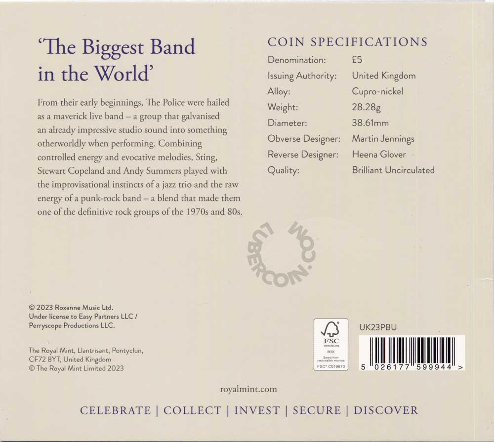 Великобритания 5 фунтов 2023 Легенды музыки. The Police (Монета в оригинальном буклете) BU