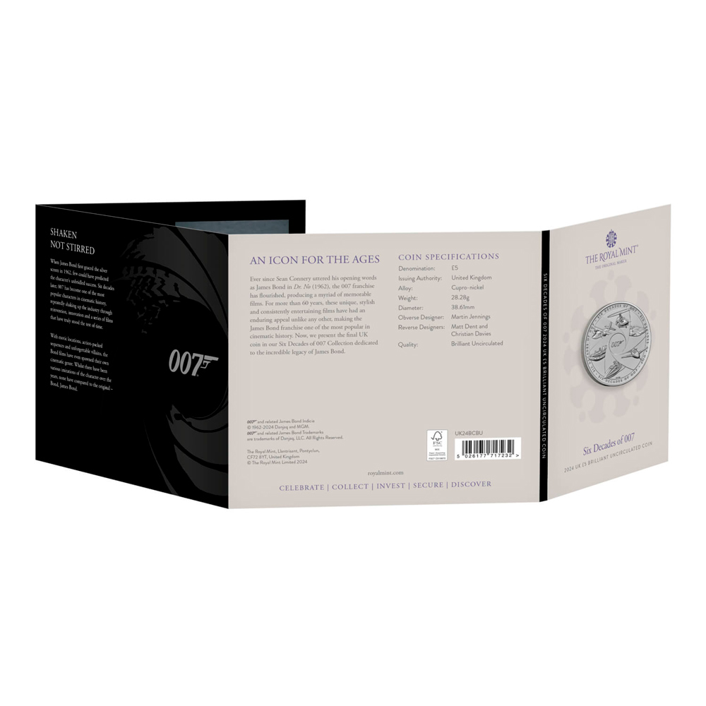 Великобритания 5 фунтов 2024 Джеймс Бонд / 007: Шесть десятилетий (Монета в оригинальном буклете) BU