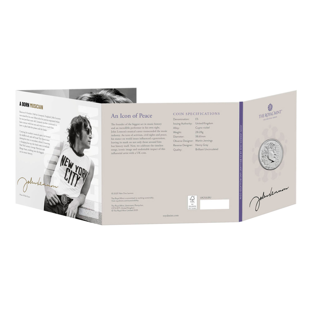Великобритания 5 фунтов 2025 Легенды музыки. Джон Леннон (Монета в оригинальном буклете) BU