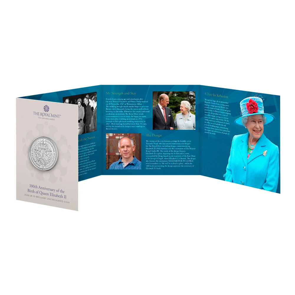 Великобритания 5 фунтов 2026 Королева Елизавета II. 100 лет (Монета в оригинальном буклете) BU