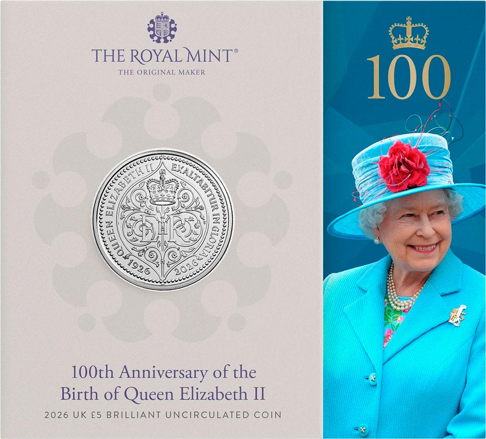 Великобритания 5 фунтов 2026 Королева Елизавета II. 100 лет со дня рождения (Монета в оригинальном буклете) BU