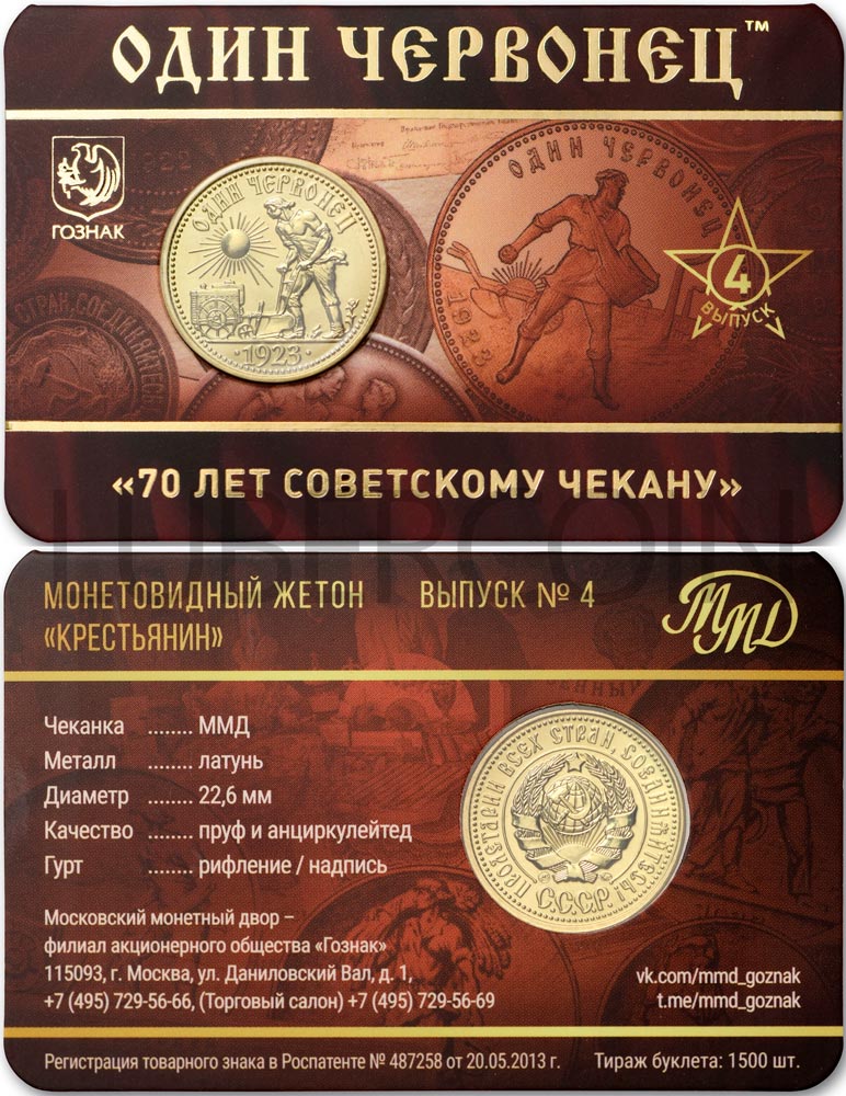 ГОЗНАК жетон Один червонец. 70 лет советскому чекану. «Крестьянин». Выпуск № 4. ММД UNC