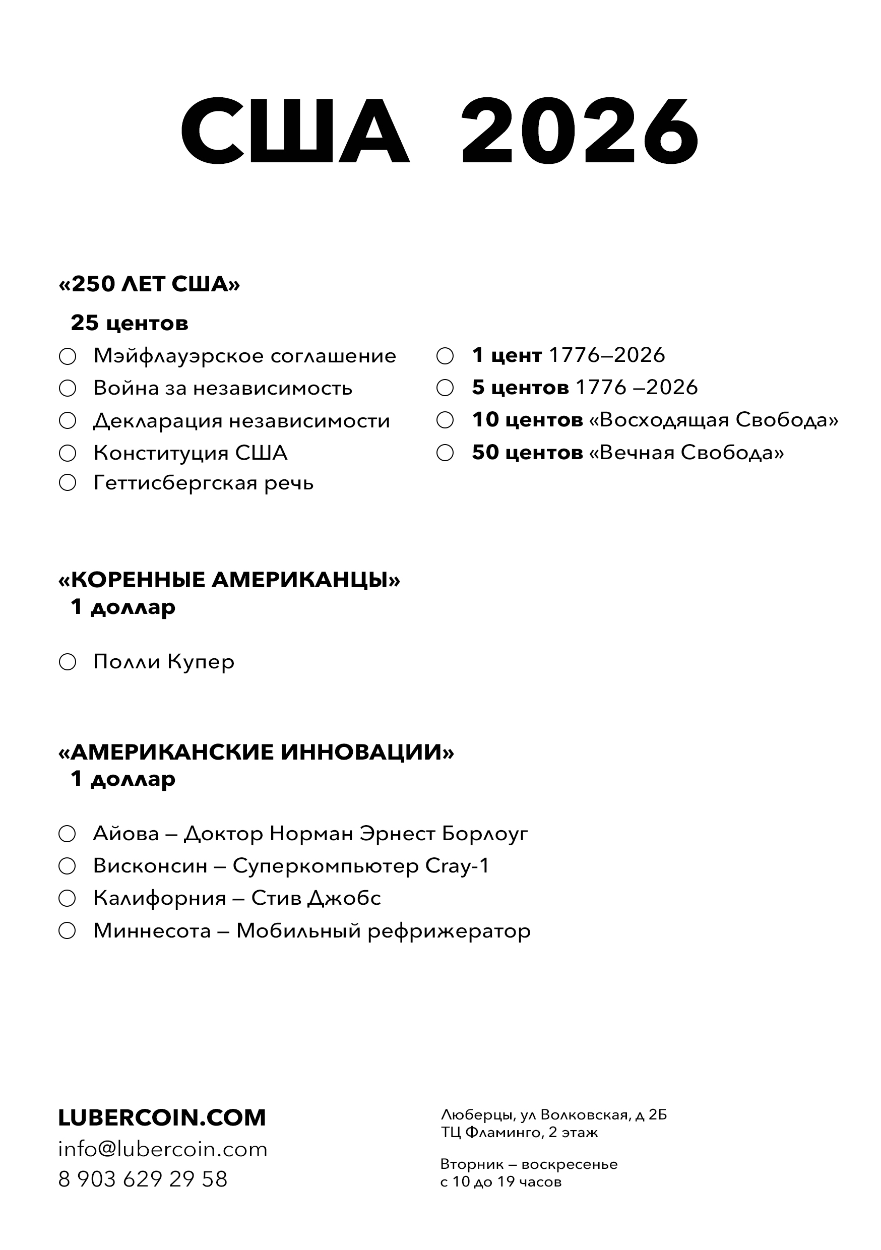США 50 центов «Вечная Свобода» с двойной датой «1776 — 2026». Два монетных двора: «D» — Денвер, «P» — Филадельфия.Впервые с 1976 года меняется дизайн монеты номиналом 50 центов для обращения. Вместо портрета тридцать пятого президента США Джона Ф. Кеннеди и Печати Президента США на монете 2026 года будет изображена Статуя Свободы.
