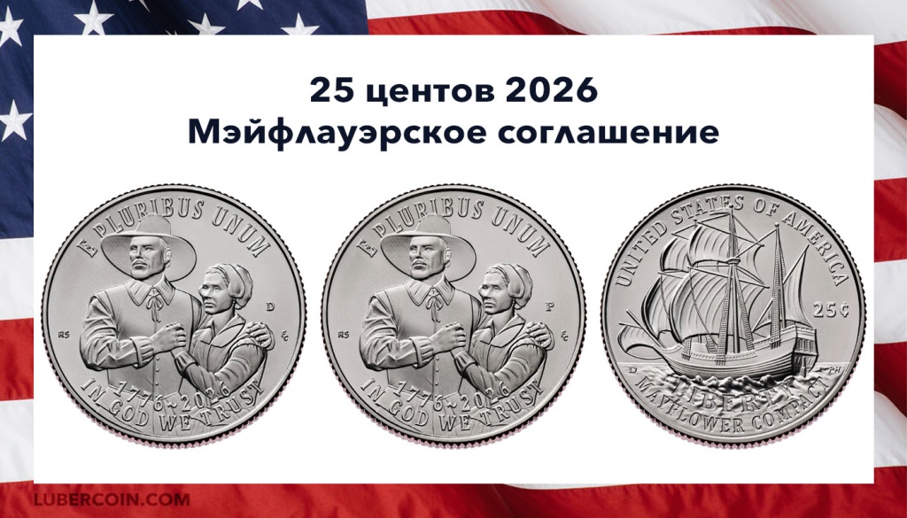 США 25 центов «Мэйфлауэрское соглашение» с двойной датой «1776 — 2026». Два монетных двора: «D» — Денвер, «P» — Филадельфия.Монета посвящена документу о самоуправлении, который пилигримы подписали на борту корабля «Мэйфлауэр» в 1620 году. «Мэйфлауэрское соглашение» считается предшественником Декларации независимости и Конституции США.