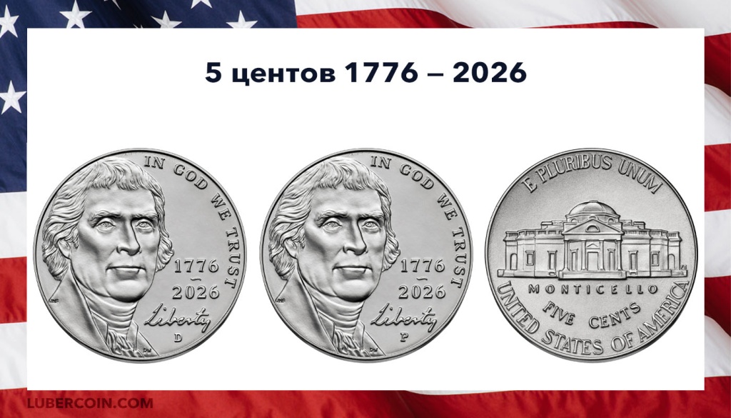 США 5 центов с двойной датой «1776 — 2026». Два монетных двора: «D» — Денвер, «P» — Филадельфия.Дизайн монеты номиналом 5 центов не изменится в 2026 году. Единственное изменение — двойная дата.