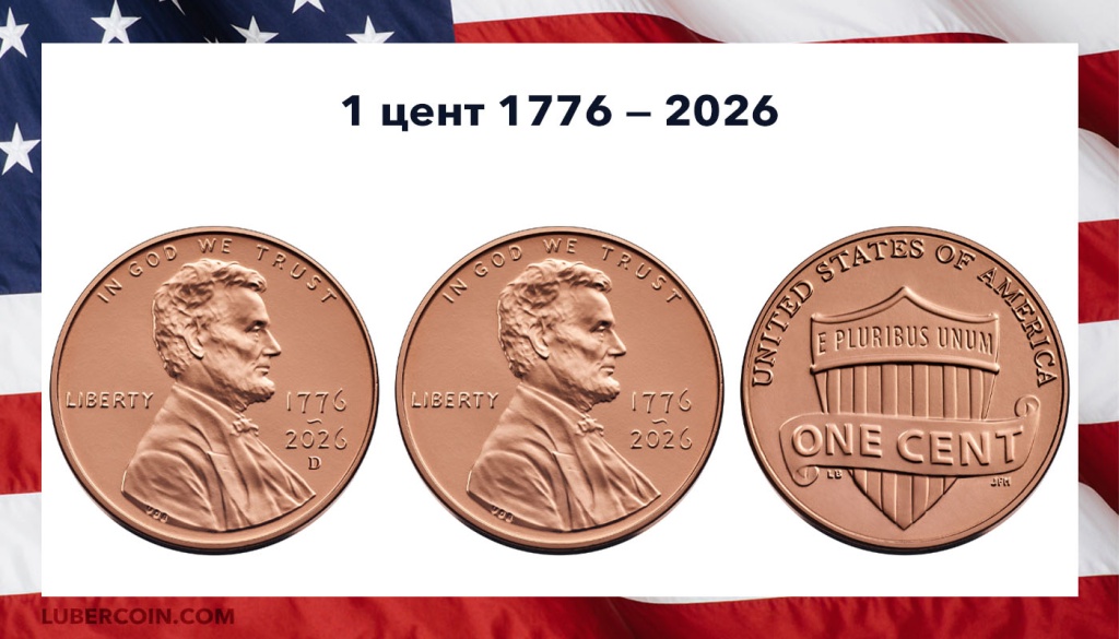 США 1 цент с двойной датой «1776 — 2026». Два монетных двора: «D» — Денвер, без обозначения — Филадельфия.Дизайн монеты номиналом 1 цент не изменится в 2026 году. Единственное отличие — двойная дата.