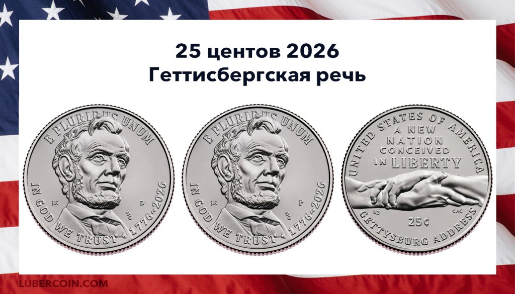 США 25 центов «Геттисбергская речь» с двойной датой «1776 — 2026». Два монетных двора: «D» — Денвер, «P» — Филадельфия.На аверсе изображён Авраам Линкольн — шестнадцатый президент США.