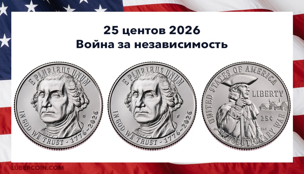 США 25 центов «Война за независимость» с двойной датой «1776 — 2026». Два монетных двора: «D» — Денвер, «P» — Филадельфия.На аверсе изображён Джордж Вашингтон — первый президент Соединённых Штатов и главнокомандующий Континентальной армией во время Войны за независимость.