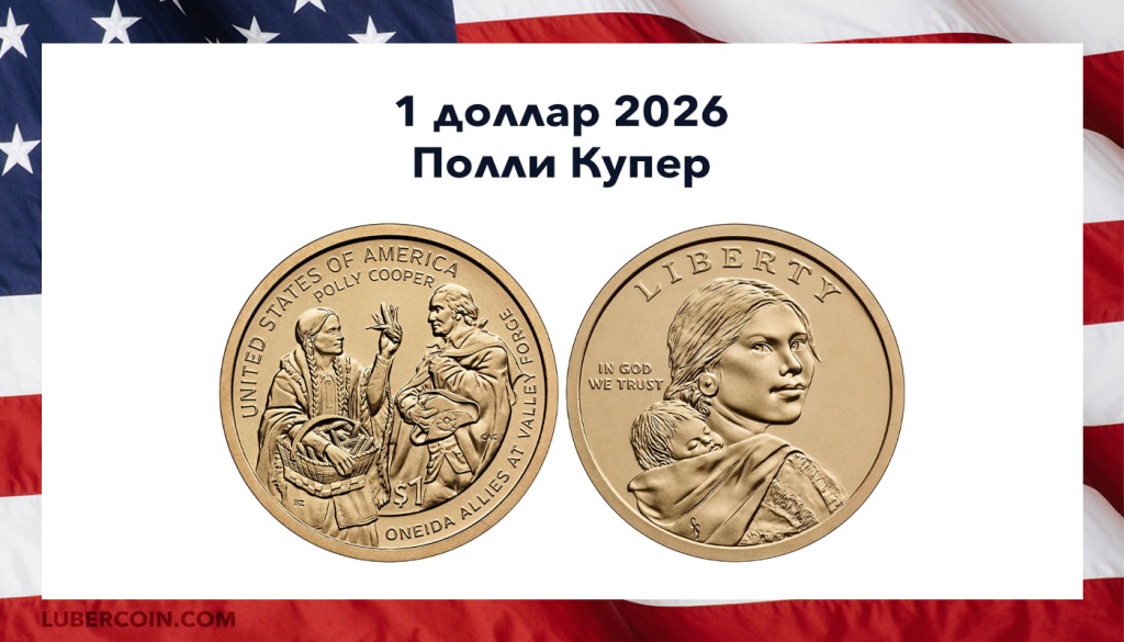 США 1 доллар 2026 года серии «Коренные американцы». Знак монетного двора — «D» или «P» — указан на гурте монет.Монета 2026 года посвящена Полли Купер — женщине из племени Онейда, которая помогала голодающей Континентальной армии во время Войны за независимость.