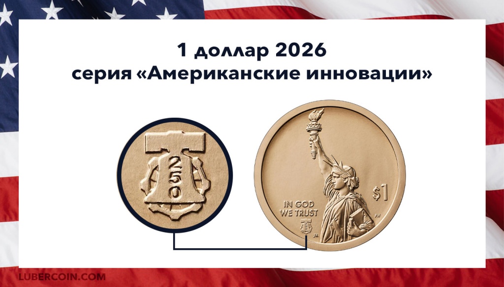 США 1 доллар 2026 года серии «Американские инновации». Знак с Колоколом Свободы. Знак монетного двора — «D» или «P» — указан на гурте монет.Четыре монеты будут посвящены выдающимся инновациям в четырёх штатах: