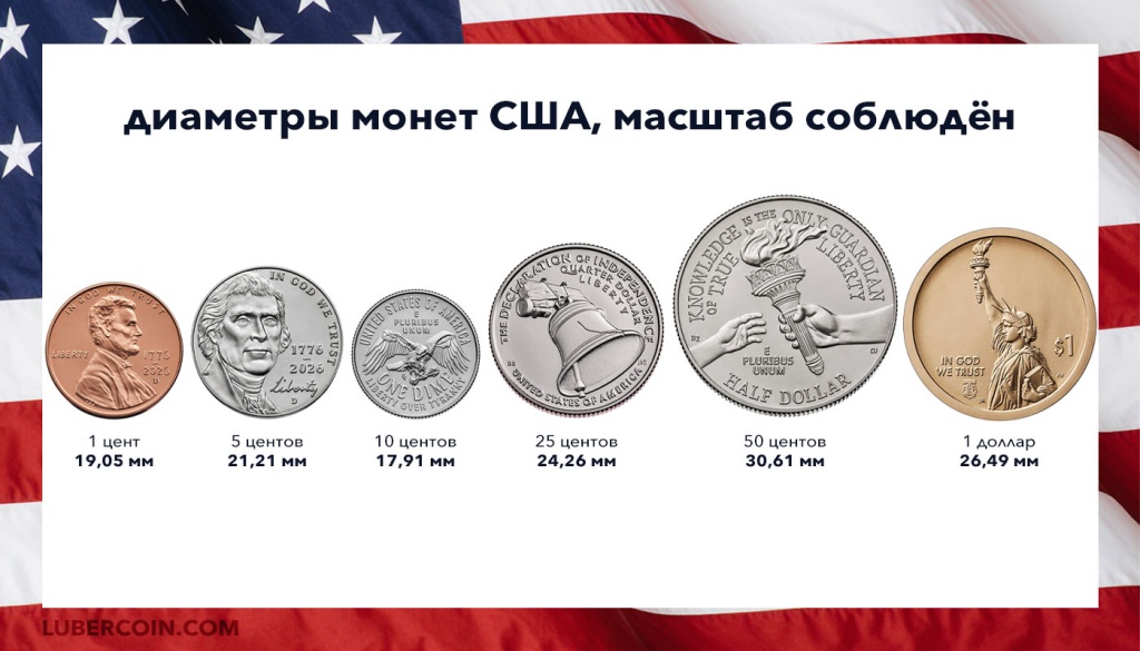Диаметры монет США из недрагоценных металлов варьируются. Ниже — картинка с размерами всех монет из недрагоценных металлов, которые будут выпущены в 2026 году.