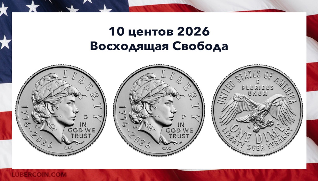 США 10 центов с двойной датой «1776 — 2026». Два монетных двора: «D» — Денвер, «P» — Филадельфия.Впервые с 1965 года дизайн монеты полностью изменён. Вместо портрета Франклина Рузвельта, тридцать второго президента США, на монете изображён профиль Свободы.