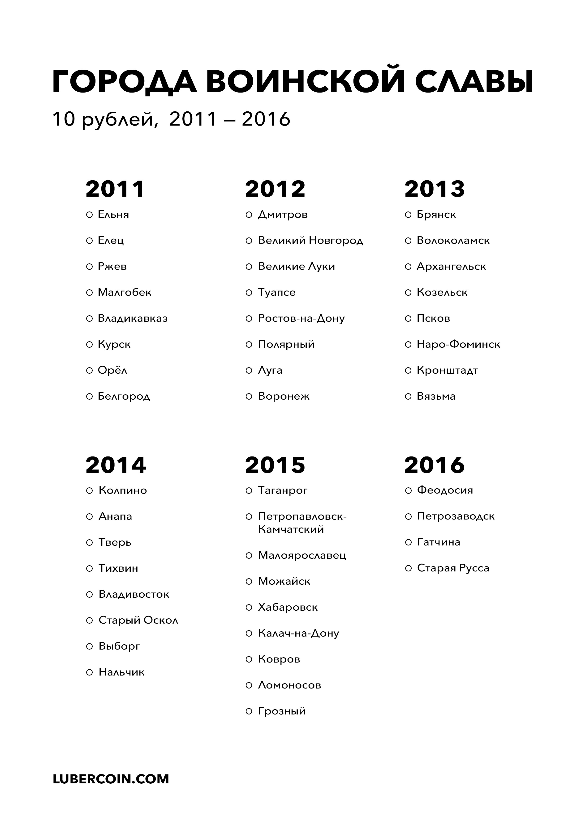 Монеты выходили каждый год с 2011 по 2016 год включительно.